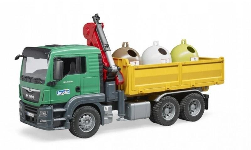 MAN TGS Wywrotka z żurawiem i kontenerami recykling - Bruder 03753Skala 1:16Wymiary:Seria ProfiRekomendacja wiekowa: dzieci powyżej 4 latDoskonała zabawka edukacyjna, której głównymi cechami są:- przeszklona kabina z otwieranymi drzwiami i składanymi lusterkami- miękkie, gumowe opony z...