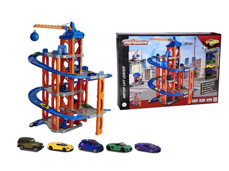 Garaż z 5 poziomami, do których można dotrzeć zmotoryzowaną (elektryczną) windą. Garaż posiada liczne atrakcje, które urozmaicą dziecięcą zabawę. Wśród nich dźwig z obracaną o 360° kulą, myjnia, warsztat samochodowy oraz stacja benzynowa. Do zestawu dołączonych zostało 5 metalowych pojazdów w skali 1:64, 7.5 cm, Wymiary: 53 x 56 x 73 cm, 3l+