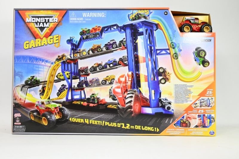 Ten ogromny zestaw Monster Jam ma 61 cm wysokości i ponad 122 cm szerokości, dzięki czemu możesz wykonywać niesamowite akrobacje Monster Jam! Załaduj ciężarówki i przekręć dźwignię, aby wjechać windą. Przenieś akcję Monster Jam na wyższy poziom dzięki prawdziwym światłom i dźwiękom. W tym garażu...