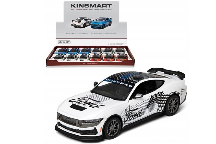 Metalowy model kolekcjonerski 2024 Ford Mustang Dark Horse w skali 1:38 to propozycja dla fanów motoryzacji i szybkich aut. Wykonany z dbałością o szczegóły samochód posiada mechanizm pull-back, który pozwala na samodzielną jazdę po naciągnięciu, a także otwierane drzwi, co dodaje realizmu...