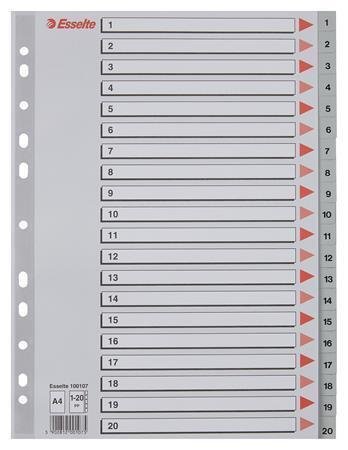 Rejstříky pro číselné roztřídění dokumentů v pořadačích či deskách do formátu A4 s popisovatelnou titulní stranou. Zesílená multiperforace plastovým proužkem na titulní straně. 20 dělicích listů se štítky 1-20 pro rychlou orientaci v obsahu.Univerzální multiperforace (11 děr) pro založení do...