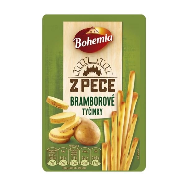 Bohemia tyčinky bramborové jsou vždy do křupava pečené, krásně tenké a ochucené tak, aby chutnaly co nejlépe;Složení: bramborový škrob (30 %), pšeničná mouka, bramborový prášek (15 %), slunečnicový olej, palmový olej, jedlá sůl, modifikovaný bramborový škrob, kvasničný extrakt, syrovátka, aroma,...