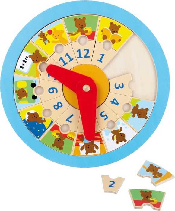 Ke každé hodině ukazuje malý medvěd jinou aktivitu – někdy jí, cáká se ve vodě, spí a nebo si čte. K času musí děti najít obrázek s odpovídající číslicí. Tímto způsobem se děti už ve školce učí hodiny a trénují jemnou motoriku.Německá firma Legler zaměřená na výrobu kvalitních dřevěných hraček od...