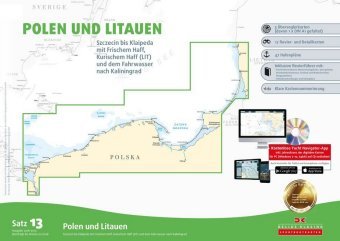 Der Satz 13 der Delius Klasing Sportbootkarten enthält 5 Überseglerkarten sowie 16 Revier- und Detailkarten zur Navigation an der polnischen und litauischen Ostseeküste von Stettin bis Klaipeda mit Frischem Haff und Kurischem Haff.