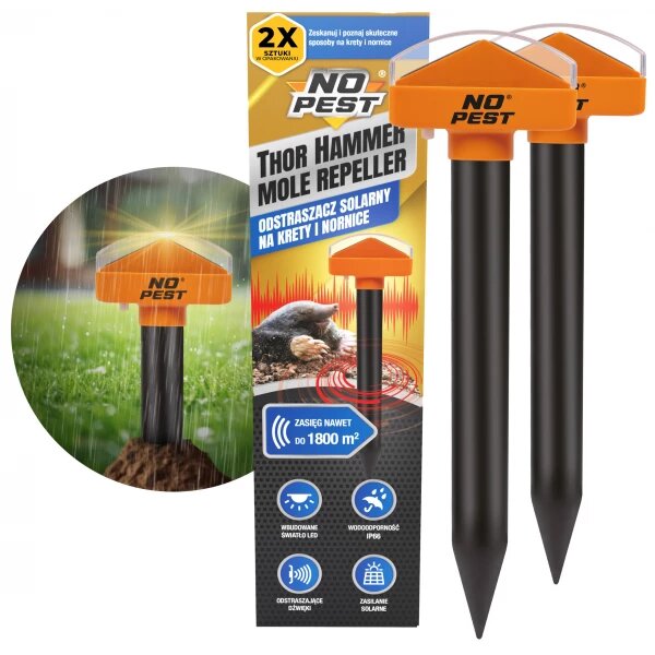 No Pest® Thor Hammer odstraszacz kretów i nornic chroni do 1800 m². Sygnały generowane przez urządzenie do odstraszania kretów przenikają przez ziemię i tworzą wyjątkowo nieprzyjazne środowisko dla kretów oraz innych podziemnych gryzoni, takich jak nornice, norniki i bobry wodne.