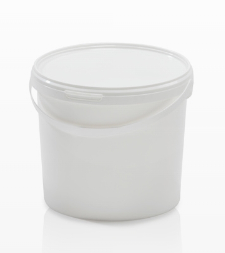 Plastowy biały kubeł z pokrywką z zabezpieczeniem i uchwytem do przenoszenia.