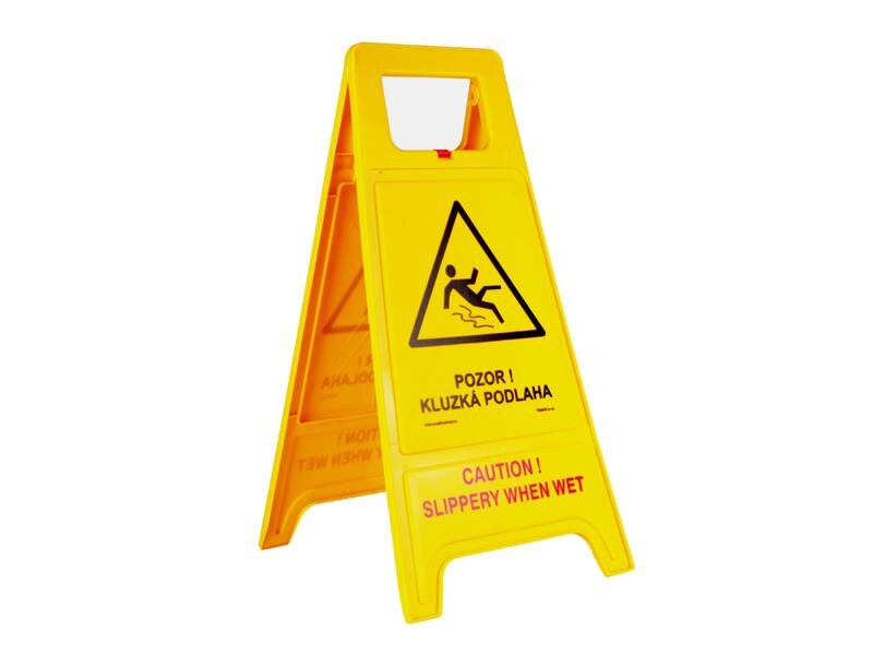 Stojak ostrzegawczy - Uwaga, mokra podłoga, stojak w kształcie litery A Stojak bezpieczeństwa z zatrzaskiem zapobiegającym przypadkowemu złożeniu. Stojak ostrzega przed ryzykiem poślizgnięcia, oznacza nieczytelne schody, obniżony poziom lub inne niebezpieczeństwo w przestrzeni. Zmniejsza ryzyko powstania urazu, nadaje się do wszystkich miejsc ogólnodostępnych, takich jak lotniska, urzędy pocztowe, banki, urzędy. Zaletą stojaka jest łatwa obsługa, stabilność i dobra widoczność.