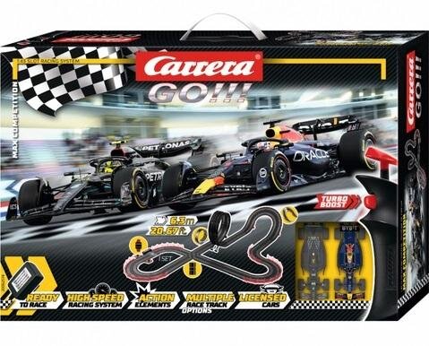 Atmosfera Formuły 1 z szybkimi wyścigami Carrera GO!!! Zestaw Max Competition zawiera dwa wyczynowe samochody wyścigowe Formuły 1. Prędkość Mercedes-AMG F1 W14 E Performance L. Hamilton z zespołu Formuły 1 Mercedes-AMG Petronas i moc Red Bull Racing RB19 M. Verstappena. Zestaw pozwala fanom zanurzyć się w świat szybkich wyścigów i wziąć udział w autentycznych wyścigach Formuły 1 w domu. Tor wyścigowy o długości 6,3 m/20,67 stopy obejmuje ultraszybkie proste i skrzyżowania i kusi kierowców, aby zaryzykowali manewry wyprzedzania z dużą prędkością.