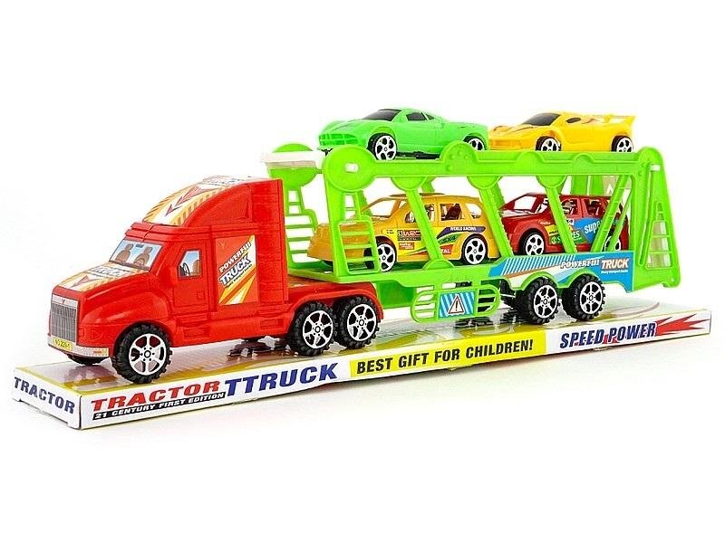 auto ciężarowe z lawetą i 4 autami, z napędem na koło zam; 43x17x8cm, PVC przeczytaj całość