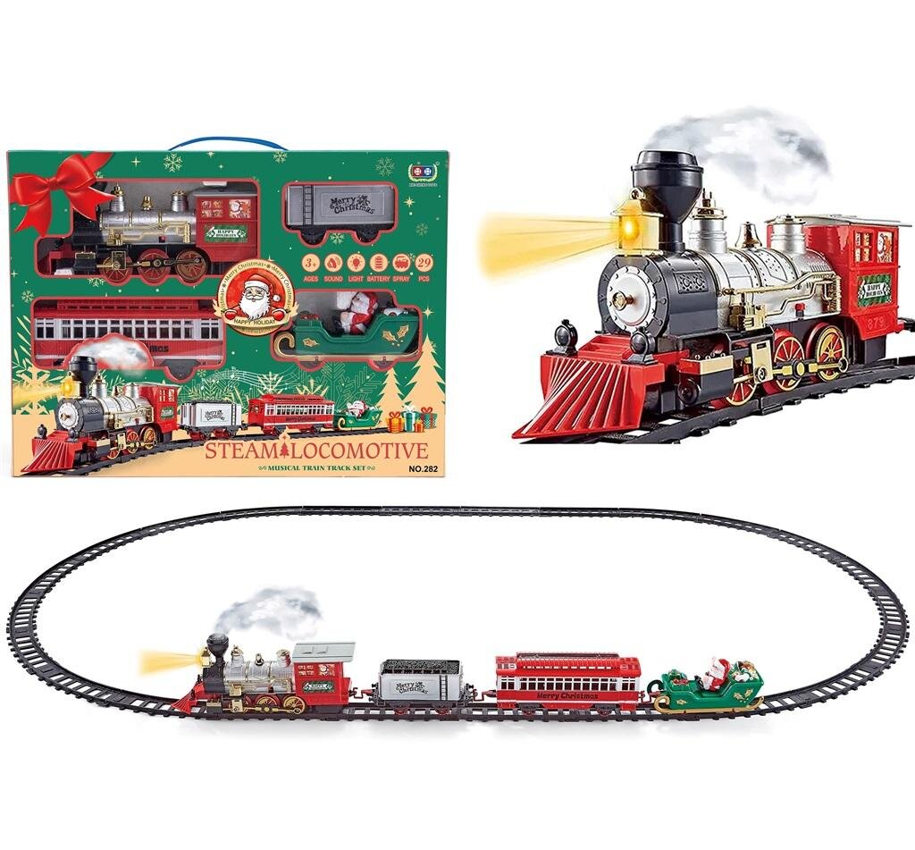 Pociąg-kolejka na baterie z saniami Mikołaja, w zestawie z torami do złożenia w kształt owalu. Ogromną zaletą jest świąteczne opakowanie. przeczytaj całość