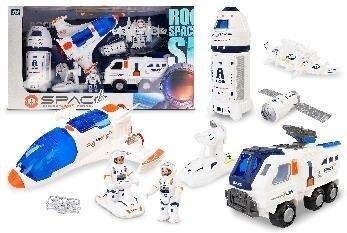 W zestawie: 3 figurki astronautów wys. 8 cm, 6-kołowa ciężarówka dł. 24 cm, rakieta wys. 24,5 cm, statek kosmiczny dł. 24 cm, kosmiczna lotnia wym. 12 x 19 cm, sonda kosmiczna dł. 9 cm, 2 mini pojazdy naziemne, funkcje: statek kosmiczny - 2 otwierane kabiny pilotów, ciężarówka - otwierana kabina...