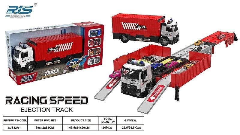 auto ciężarowe z rozkładaną naczepą, tworzącą parking, 4 autka, światło, dźwięk, bat.3xAG13 dołóćzone; 44x11x20cm, W/B przeczytaj całość