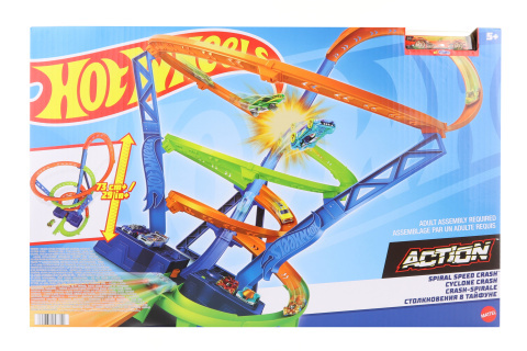 Hot Wheels® Srážka na spirále přináší skvělé vzrušení díky více než 70 cm vysoké závodní dráze, třemi nárazovými zónami a motorizovaným posilovačem, který udržuje auto v pohybu. Dojeď s angličákem Hot Wheels® až k posilovači a sleduj, jak se neustále řítí dolů po spirále. Pro ještě větší závodní...
