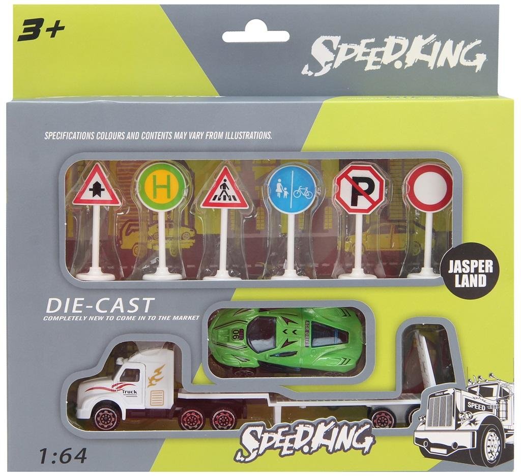 Metalowe laweta w komplecie z autem i znakami drogowymi. przeczytaj całość