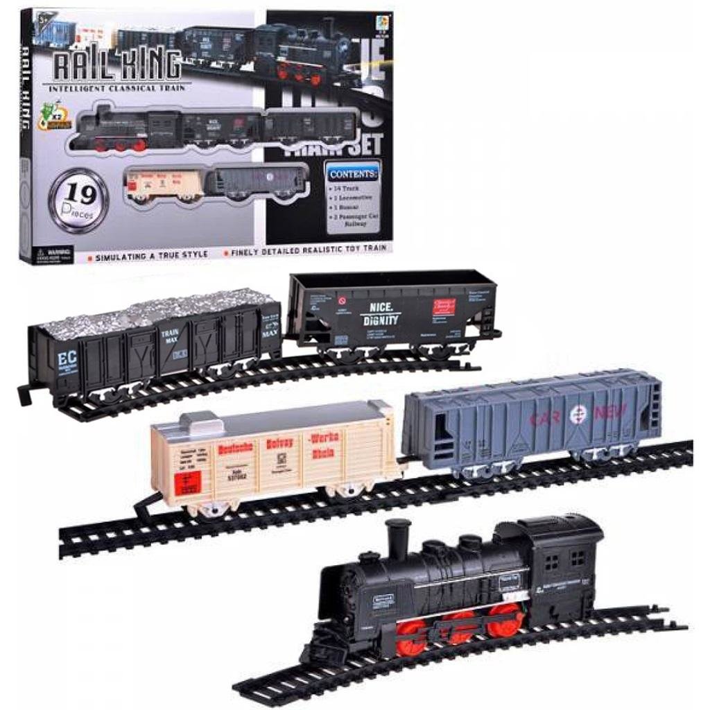 Lokomotywa na baterie z czterema wagonami i zestawem torów. przeczytaj całość