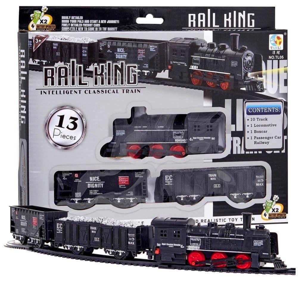Lokomotywa z dwoma wagonami i zestawem torów. Lokomotywa na baterie. przeczytaj całość