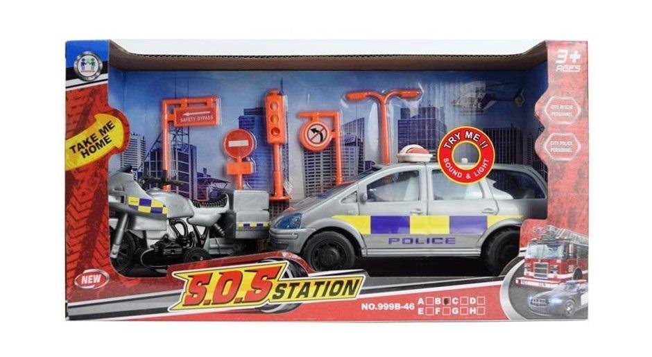 Plastikowy zestaw pojazdów policyjnych dla dzieci. Teraz żaden złodziej się nie wywinie! W zestawie: policyjny wóz, motor oraz znaki drogowe. Produkt zapakowany w kartonowe opakowanie z przezroczystym okienkiem. Podane wymiary są wymiarami opakowania. przeczytaj całość