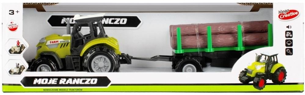 Zalety produktu: pojazd posiada efekty dźwiękowe: odgłos klaksonu, komendy wypowiadane przez kierowcę traktora "ruszamy do pracy wszyscy gotowi", "uwaga idzie burza", "koniec na dziś wracamy do domu", posiada odczepianą przyczepę z balami drzewa, traktor posiada efekty świetlne. Maszyna Rolnicza...