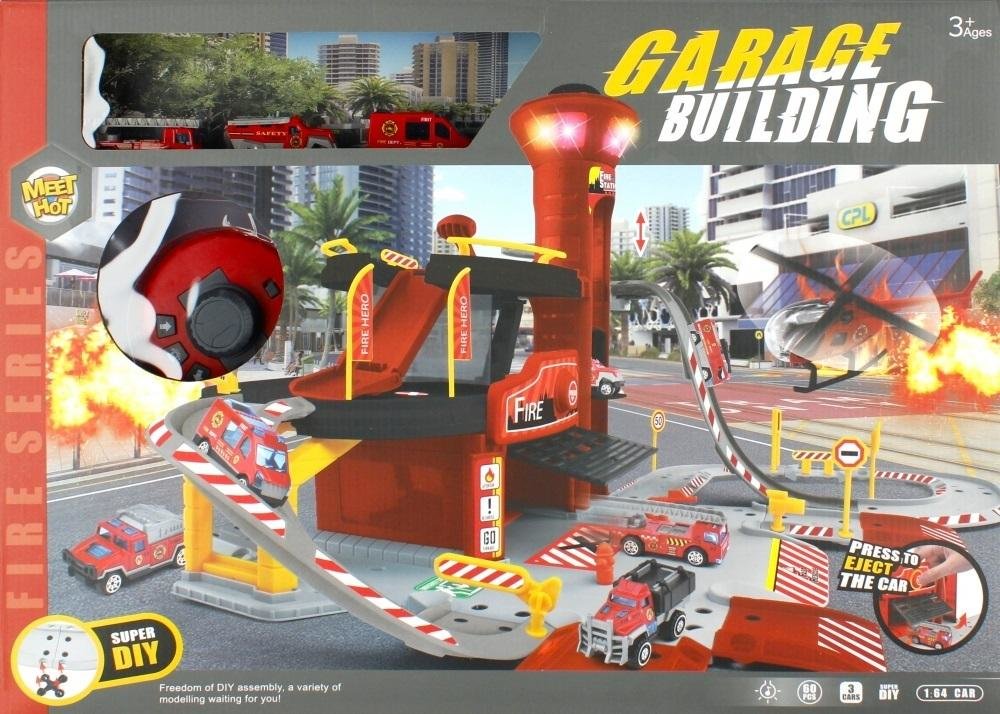 Zalety produktu: rozwija kreatywność dziecka, parking 60 elementów Straż Pożarna z akcesoriami metalowymi, efektem świetlnym oraz dźwiękowym, naciśnij jeden z trzech przycisków znajdujących się na wieży parkingowej, efekt- lekka muzyka i światła, automatyczne podnoszenie platformy z autem...