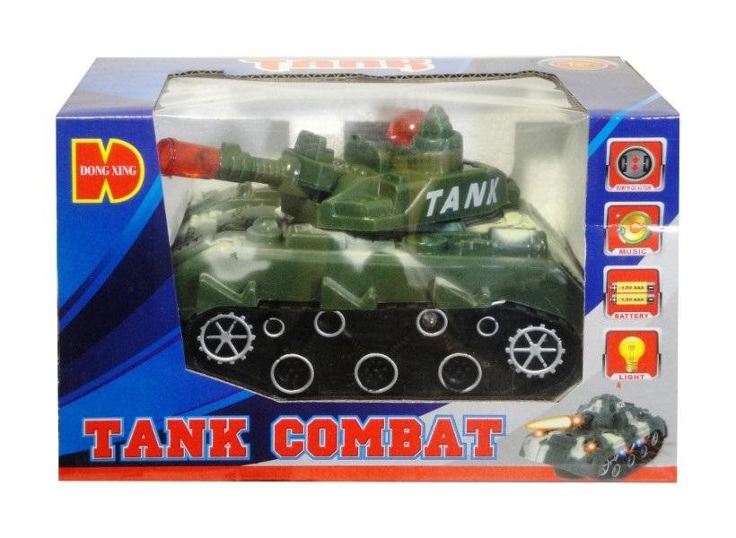Plastikowy czołg jeżdżący dla dzieci. Urozmaici czas podczas zabaw militarnych. Zabawka wydaje dźwięki i świeci kolorowym światełkiem. Zabawka działa na baterie typu AA. Baterie nie znajdują się w zabawce. Zabawka przeznaczona dla dzieci od 3 lat. Podane wymiary są wymiarami opakowania. Zabawka zapakowana w kartonowe opakowanie z przezroczystym okienkiem.