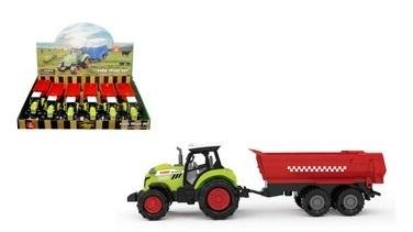 Plastikowy traktor z przyczepą. Pojazd świeci światełkiem oraz wydaje dźwięki: zapalania silnika. Zabawka działa na baterie typu AG13. Baterie znajdują się w zabawce. Zabawka dla dzieci od 3 lat. przeczytaj całość