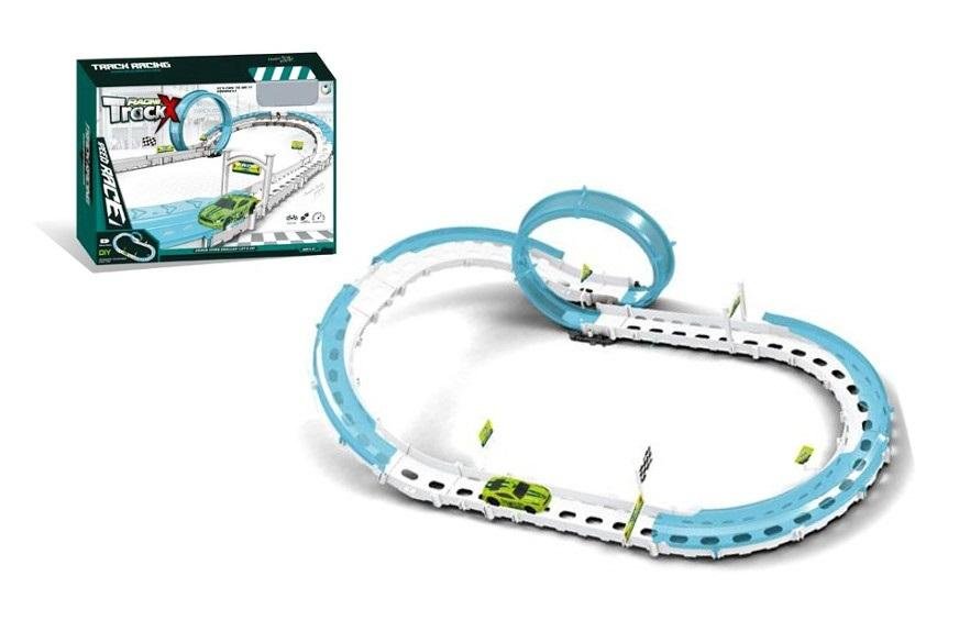 Zabawka tor wyścigowy dla małych rajdowców. Tor z 1 pętlą. Zestaw składa się z 26 elementów i znajduje się w nim także 1 samochód, znaki drogowe i kabel USB. Wymiary toru: 110 x 42 x 26 cm. Zabawka dla dzieci od 3 lat. Produkt działa na baterię litową-akumulator. Znajduje się w zabawce. Zestaw zapakowany w kartonowe opakowanie z przezroczystym okienkiem. Podane wymiary są wymiarami opakowania.