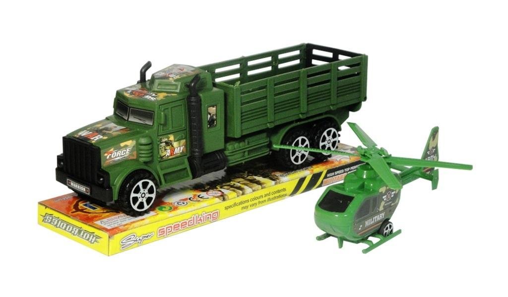 Ciężarówka wojskowa w zestawie z helikopterem. Pojazdy na napęd cierny. Produkt zapakowany w kartonową podstawkę z przezroczystym kloszem. Podane wymiary są wymiarami zabawki w opakowaniu. przeczytaj całość