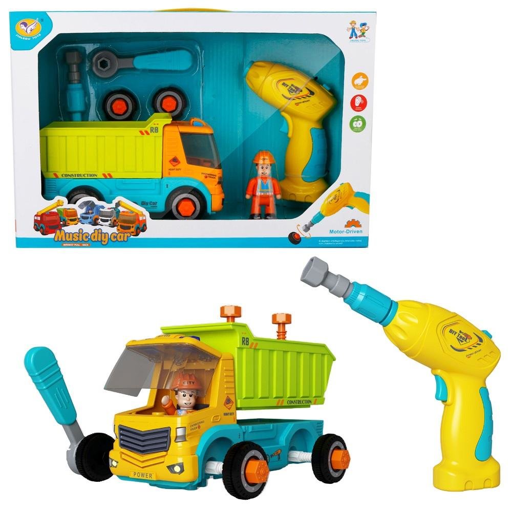 Wywrotka do skręcania z wiertarką. W zestawie również klucz do montowania kół oraz kierowca. Przednia szyba auta podnoszona, dzięki czemu można wyjąć kierowcę. Samochód z dźwiękami, wymaga baterii - 2xAAA (niedołączone). Wiertarka wymaga baterii - 2xAA (niedołączone). przeczytaj całość