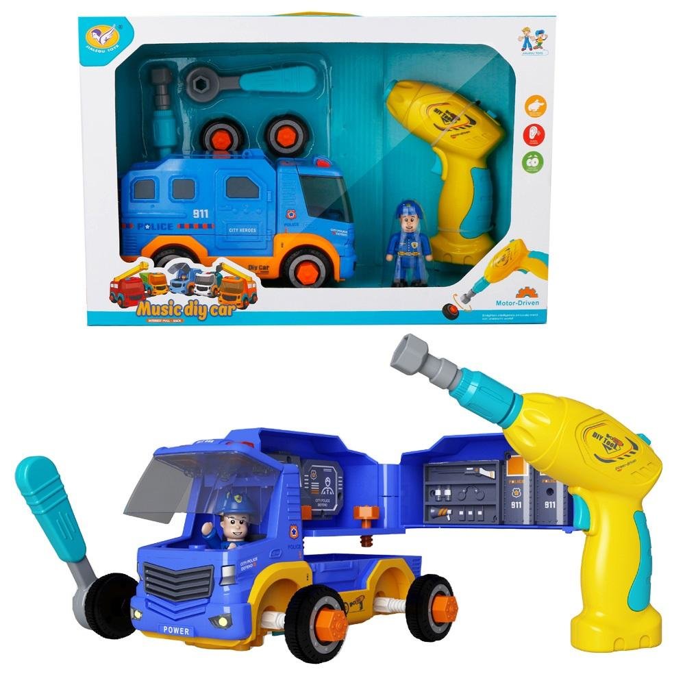 Policja do skręcania z wiertarką. W zestawie również klucz do montowania kół oraz kierowca. Przednia szyba auta podnoszona, dzięki czemu można wyjąć kierowcę. Samochód z dźwiękami, wymaga baterii - 2xAAA (niedołączone). Wiertarka wymaga baterii - 2xAA (niedołączone). przeczytaj całość