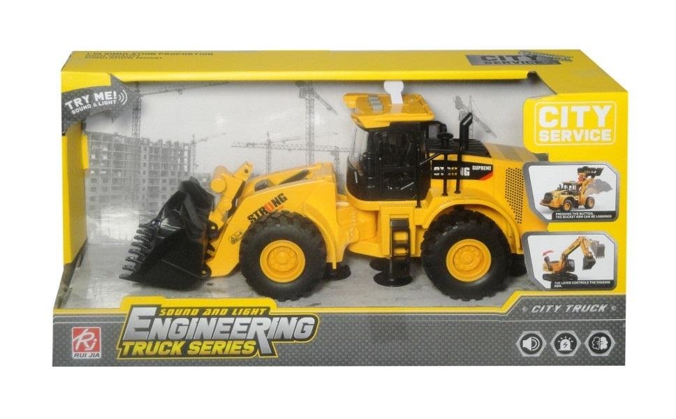 Plastikowa koparka. Zabawka ma ruchome części. Po naciśnięciu guzika łyżkę można obniżyć. Ponadto zabawka wydaje dźwięki kopania, cofania i odpalania maszyny, a przy tym świeci również kolorowym światełkiem#&Zabawka działa na baterie AG13. Baterie znajdują się w zabawce.#&Produkt zapakowany w kartonowe opakowanie z okienkiem. #&Podane wymiary są wymiarami opakowania.#&Zabawka dla dzieci od 3 lat.