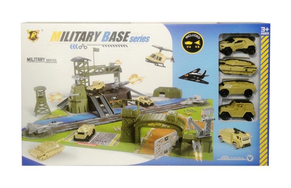 Baza wojskowa to miejsce gdzie żołnierze się szkolą oraz gdzie mają swoje maszyny. W tej bazie znajdują się 4 wojskowe pojazdy i 3 samoloty. Ponadto są także wieże obserwacyjne, brama wjazdowa, mata z wyznaczonymi miejscami oraz pasem startowym dla samolotów.#&Podane wymiary są wymiarami opakowania.#&Zabawka dla dzieci od 3 lat. #&Produkt zapakowany w kartonowe opakowanie z przezroczystym okienkiem.