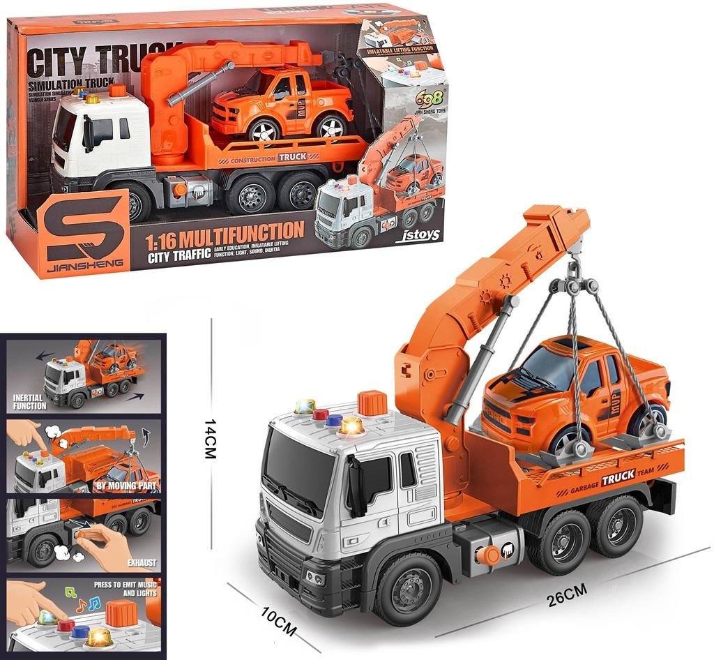 Plastikowe auto dźwig - pomoc drogowa. Autko na dachu szoferki posiada kilka przycisków, po naciśnięciu których auto wydaje dźwięki samochodu oraz świeci światłami. przeczytaj całość