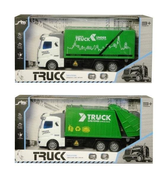 Zabawka ciężarówka śmieciarka z zamontowanym kontenerem na śmieci. W jednym modelu kontener jest ruchomy, posiada otwieraną tylnią klapę. Auta posiadają napęd pull-back. Produkt zapakowany w kartonowe opakowanie z okienkiem. Zabawka dla dzieci od 3 lat. Podane wymiary stanowią wymiar opakowania.