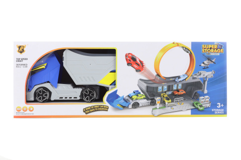 Sada obsahuje velký kamion, dráhu a 2 autíčka. Po rozložení kamion funguje ve spodní části jako základna, v horní jako prostor pro dráhu. Autíčko se vystřeluje pomocí gumiček umístěných v zadní části kamionu. Materiál plast. Baleno v krabici. Rozměry balení cca 47x17x10 cm. Věk 3+ przeczytaj całość