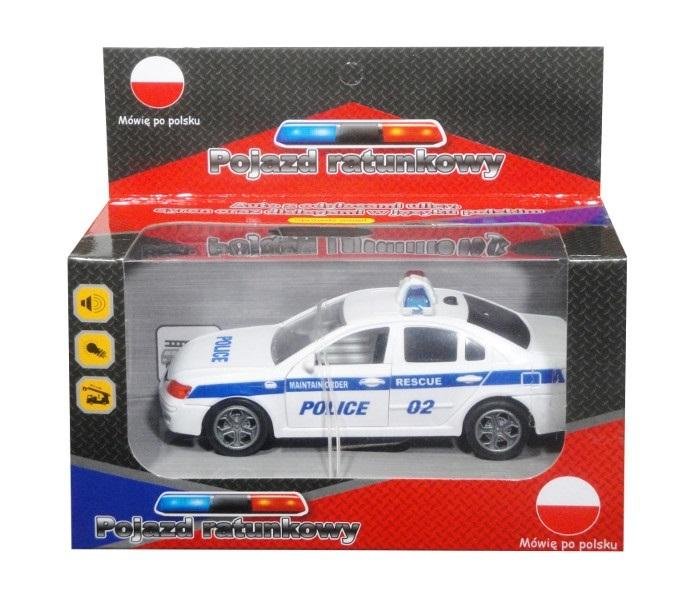 Zabawka auto ratunkowe z polskim modułem dźwiękowym. Pojazd świeci kolorowym światełkiem oraz wydaje odgłosy. "Uwaga wypadek potrzebna pomoc"; "Oj ostożnie jest bardzo ślisko"; "Przyjęliśmy zgłoszenie, ruszamy na akcję" ; "Zwolnij! Przed nami ostry zakręt"; "Halo centrala, jesteśmy na miejscu są...