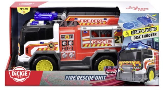 Dickie Toys A.S. Straż pożarna, 30 cm Straż pożarna bez napędu z funkcją światła i dźwięku. Ruchoma drabina z wyrzutnią dysków, otwierane boczne panele. Funkcja Try Me. Baterie w zestawie. Długość 30 cm, wiek +3l przeczytaj całość