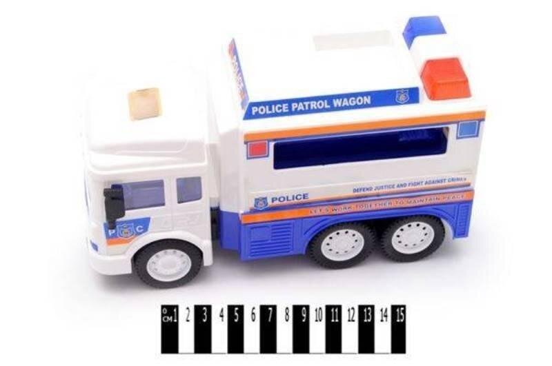 Samochód ciężarowy furgonetka policyjna,tyle drzwi się otwierają.W kolorze biało-niebieskim.Dla dzieci powyżej 3 roku życia. Zabawka z napędem.Wymiary zabawki: 29x13x15 cm przeczytaj całość