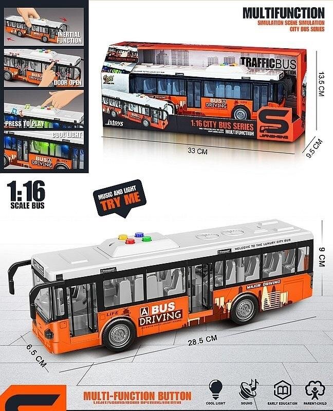 autobus na batarie, otwierane drzwi, światło, dźwięk; 28,5x9x6,5cm, W/B przeczytaj całość