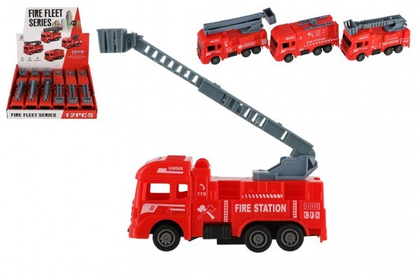 Auto hasiči plast 11cm na zpětné natažení 4 druhy 12ks v boxu