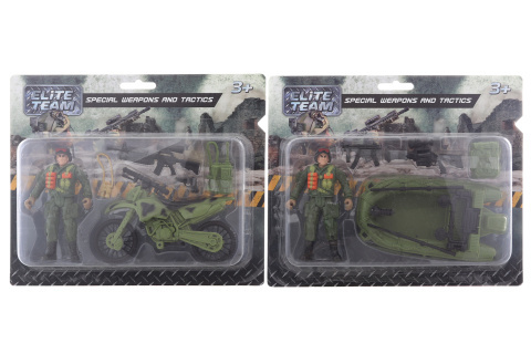 Plastový voják s doplňky. Jsou zde 2 varianty: voják, člun, 2 zbraně, batoh nebo voják, motorka, samopal, dalekohled, batoh. Rozměry vojáka cca 10 x 5,5 cm. Rozměry balení cca 23 x 19 x 4 cm. Věk 3+ przeczytaj całość