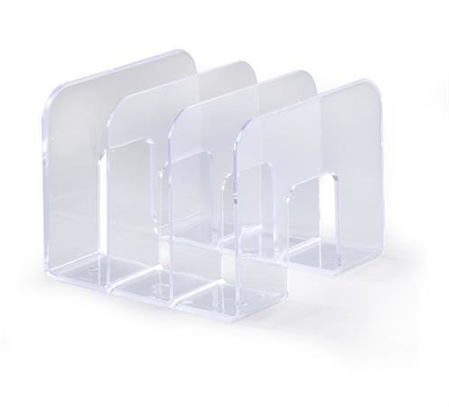 Stylowy stojak DURABLE nadaje się do prezentacji katalogów, broszur oraz przechowywania książek. Cechy: 3 przegródki; odpowiedni na książki, katalogi i broszury; odstęp między poszczególnymi przegródkami wynosi 6,5 cm; można łączyć także z innymi produktami z serii Trend. Kolor: przezroczysty Materiał: plastik Wymiary: 21x16,5x21,5 cm (SxW xG); 6,5 cm (szerokość pojedynczych przegródek);