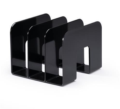 Stylowy stojak DURABLE nadaje się do prezentacji katalogów, broszur oraz przechowywania książek. Cechy: 3 przegrody; odpowiedni na książki, katalogi i broszury; odstęp między przegrodami wynosi 6,5 cm; można łączyć z innymi produktami z serii Trend. Kolor: czarny Materiał: plastik Wymiary: 21x16,5x21,5 cm (SxW xG); 6,5 cm (szerokość poszczególnych przegród);