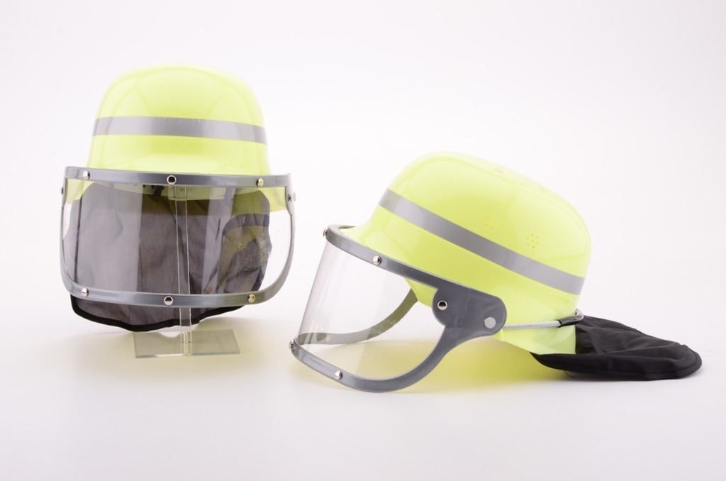 Požárnická helma s předním štítem a zadním krytím krku. przeczytaj całość
