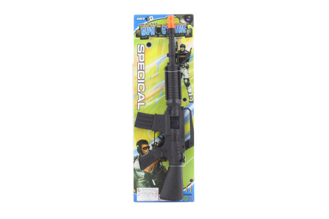 Plastový samopal rachtací. Není na náboje. Baleno na kartě. Rozměry balení 14x43x3,5 cm. Délka zbraně 42 cm. Věk 3+ przeczytaj całość