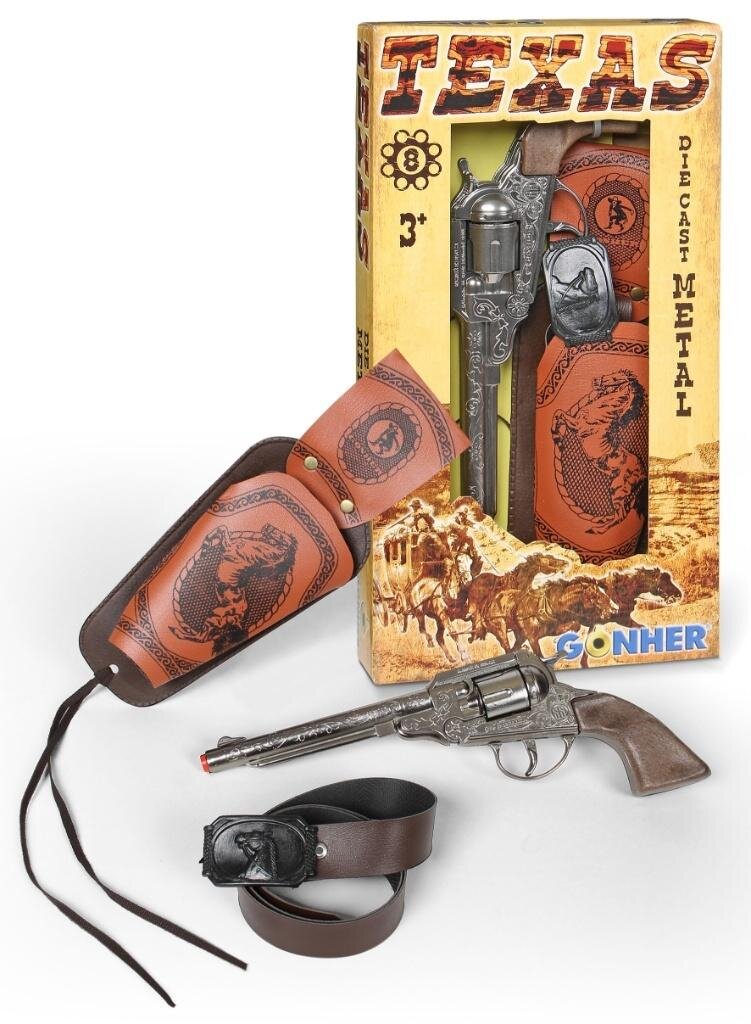 Metalowy rewolwer kowbojski na 8 naboi w zestawie z kaburą i paskiem. Wiek: 3+. Szt./karton: 10 przeczytaj całość