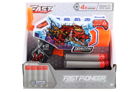 Pistole na pěnové náboje s dračím motivem. Součástí balení 4 náboje. Materiál plast. Baleno v otevřené krabici. Rozměry balení 16x15x5,5 cm. Doporučený věk 8+ przeczytaj całość