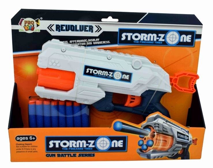 Super pistolet z bębnem na strzałki. Teraz gdy wyczerpią się naboje to żaden problem, wystarczy obrócić bębnem z pociskami i od razu mamy kolejne strzały. Nowe wzornictwo pistoletu na miękkie strzałki. Zamontowano w nim obrotowy bęben z nabojami (miękkie bezpieczne strzałki). Pociski do pistoletu...