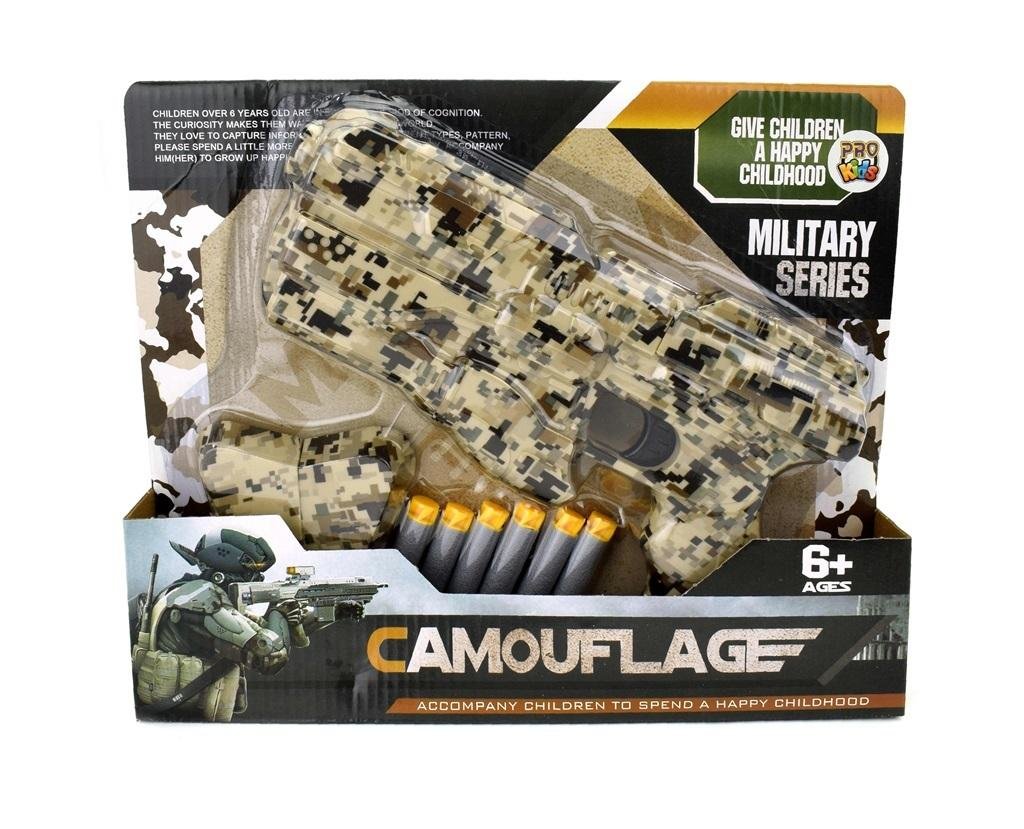 Pistolet na strzałki w unikalnym kolorze militarnym. Zestaw dla miłośnika wojska. Zabawka idealnie sprawdzi się do zabawy w terenie, gdzie kamuflaż i nauka wtopienia się w otoczenie daje niezwykłą przewagę.Pistolet z kompletem 6 strzałek. Malowanie pistoletu w wojskowe barwy kamuflażowe. przeczytaj całość