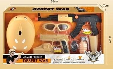 Zestaw wojskowy, który zawiera: kask, 2 pistolety, okulary, zegarek, granat. Produkt nie potrzebuje baterii. Zabawka przeznaczona dla dzieci powyżej 3 roku życia. przeczytaj całość