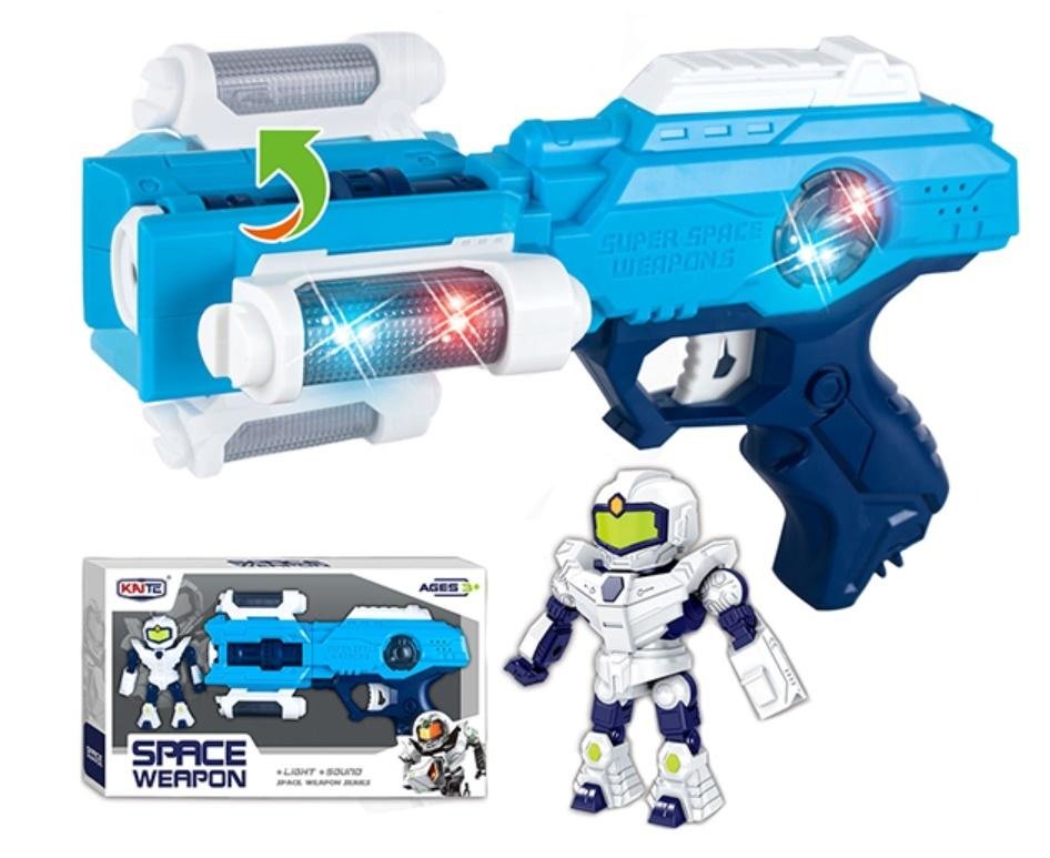 W ZESTAWIE: PISTOLET 26 CM. ROBOT 11 CM., FUNKCJE: ŚWIATŁO, DŹWIĘK, RUCHOME ELEMENTY, WYM. OPK: 34 X 22 X 6 CM., BATERIE: 3 X AA BRAK W ZESTAWIE, 3+ przeczytaj całość